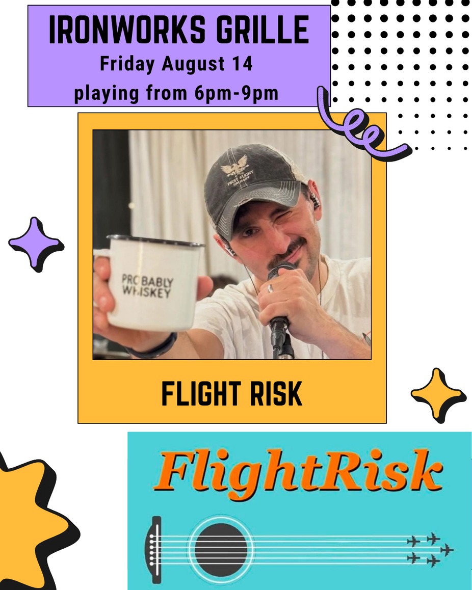 Make plans for Friday, August 14th from 6β9 PM and experience Flight Risk live at Ironworks Grille on the River. Kick back with great food and drinks while enjoying the lively riverfront setting. Let the music carry you into a weekend full of fun and relaxation.