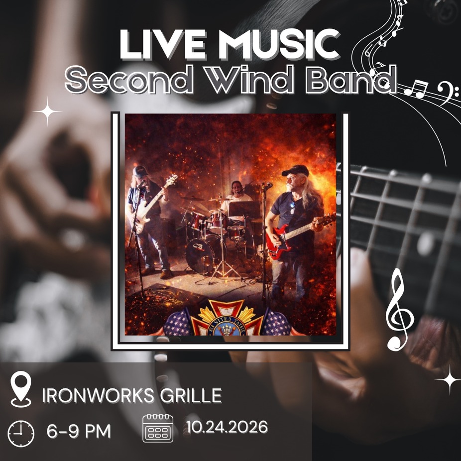 Join us on April 10th from 6β9 PM at Ironworks Grille on the River for live music with Second Wind Band. Kick back, relax, and enjoy an evening filled with great tunes and riverfront views.